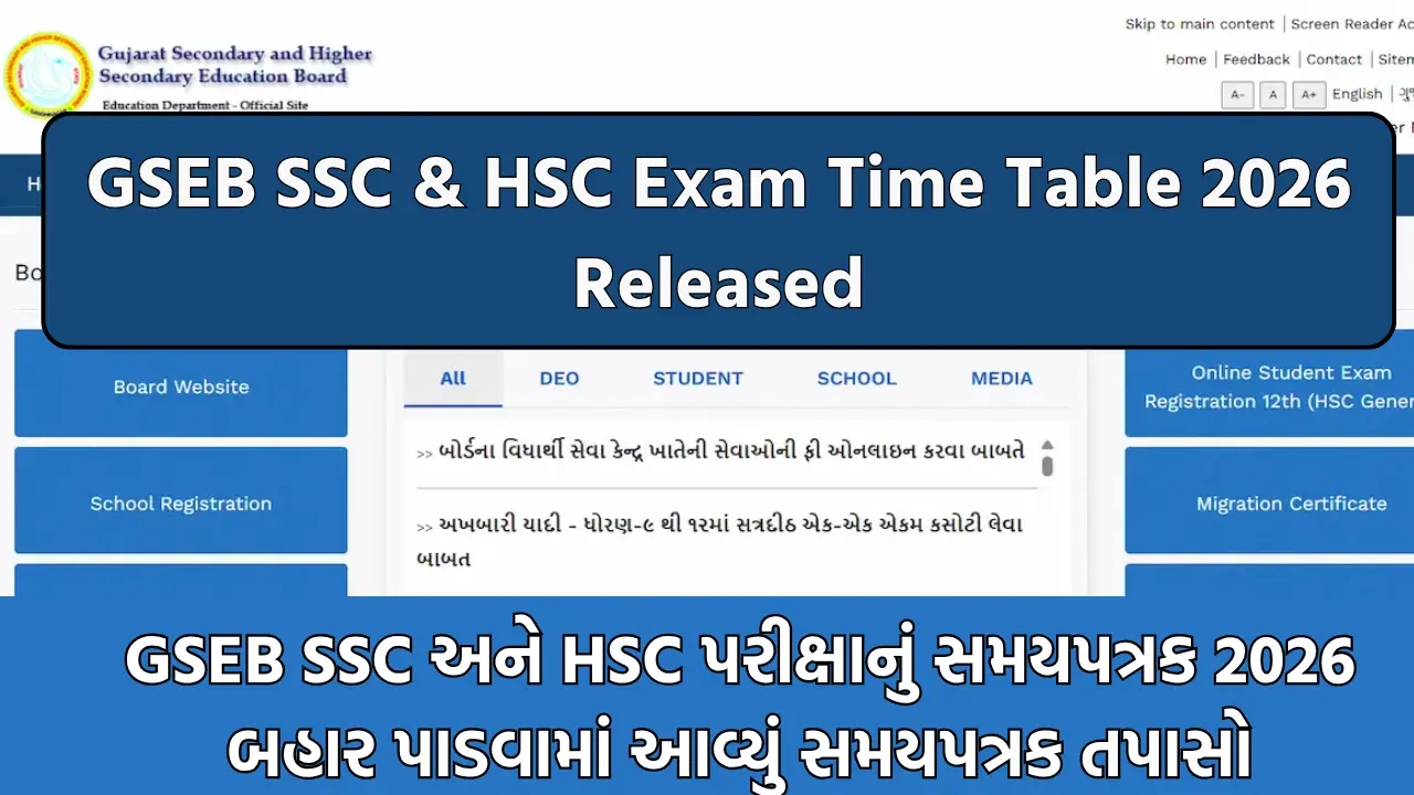 ગુજરાત માધ્યમિક અને ઉચ્ચતર માધ્યમિક શિક્ષણ બોર્ડ (GSEB), ગાંધીનગર દ્વારા આગામી SSC (ધોરણ 10), HSC (ધોરણ 12 – વિજ્ઞાન, સામાન્ય, વ્યાવસાયિક અને સંસ્કૃત પ્રવાહો) મુખ્ય પરીક્ષાઓનું સમયપત્રક સત્તાવાર રીતે જાહેર કરવામાં આવ્યું છે. આ પરીક્ષાઓ સમગ્ર ગુજરાતમાં 26 ફેબ્રુઆરી 2026 થી 16 માર્ચ 2026 દરમિયાન લેવામાં આવશે.