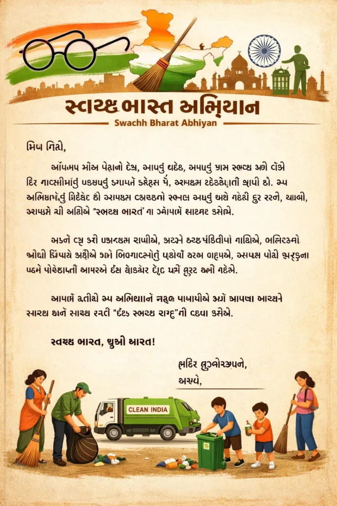 Swachh Bharat Abhiyan Letter in Gujarati: અહીં સ્વચ્છ ભારત અભિયાન વિષય પર એક સરળ અને સુંદર ગુજરાતી પત્ર આપેલ છે (શાળા/કૉલેજ ઉપયોગ માટે યોગ્ય):